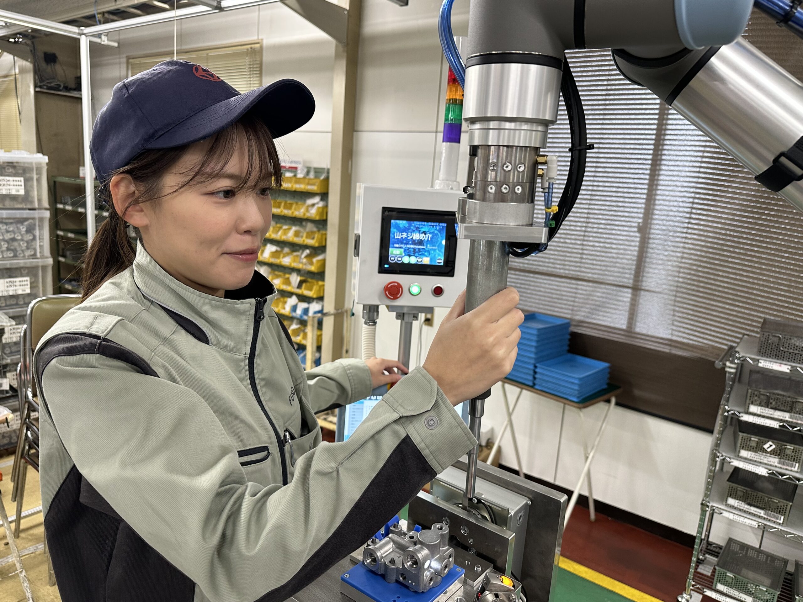 当社は、主にパワーショベルの油圧ポンプに指示を出すレギュレーターを製造しています。レギュレーターは、いわばエンジンを動かす“頭脳”のような存在で、機械の動きを制御する要のパーツです。お客様のニーズに応じて、オーダーメイドで形にする生産方法で、現在は月に約2万個のレギュレーターを生産。その一部では自社開発の協働ロボットも稼働し、品質の安定と効率化を両立しています。