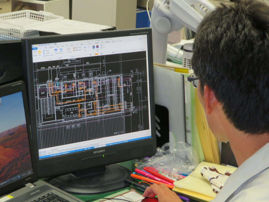 私たちのしごとは、みんなが気持ちよく過ごせる『カイテキ(快適空間)』を「創造」し「想像」することです。建物の中で人が快適に過ごすには、空気や水などのライフラインを引きこまないといけない。そのライフラインを設計して工事完了までの指揮をとる、要は現場監督をするのが当社の仕事です。