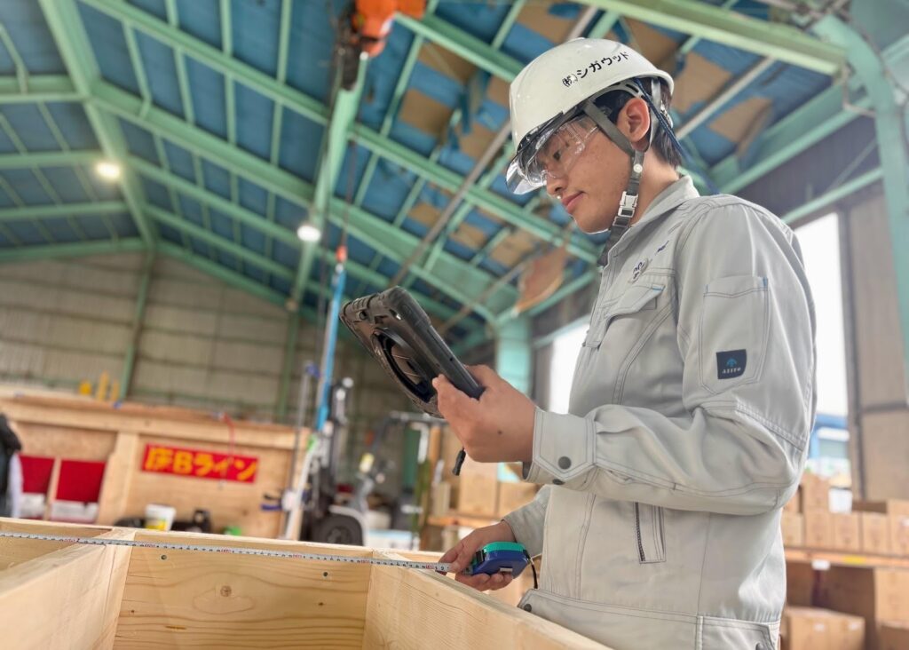 僕の作業としては、屋根や床に使う材料をカットする機械のオペレーターをしています。「3次元マルチカットソー」という機械で、図面通りに木材を正確にカットする仕事です。
